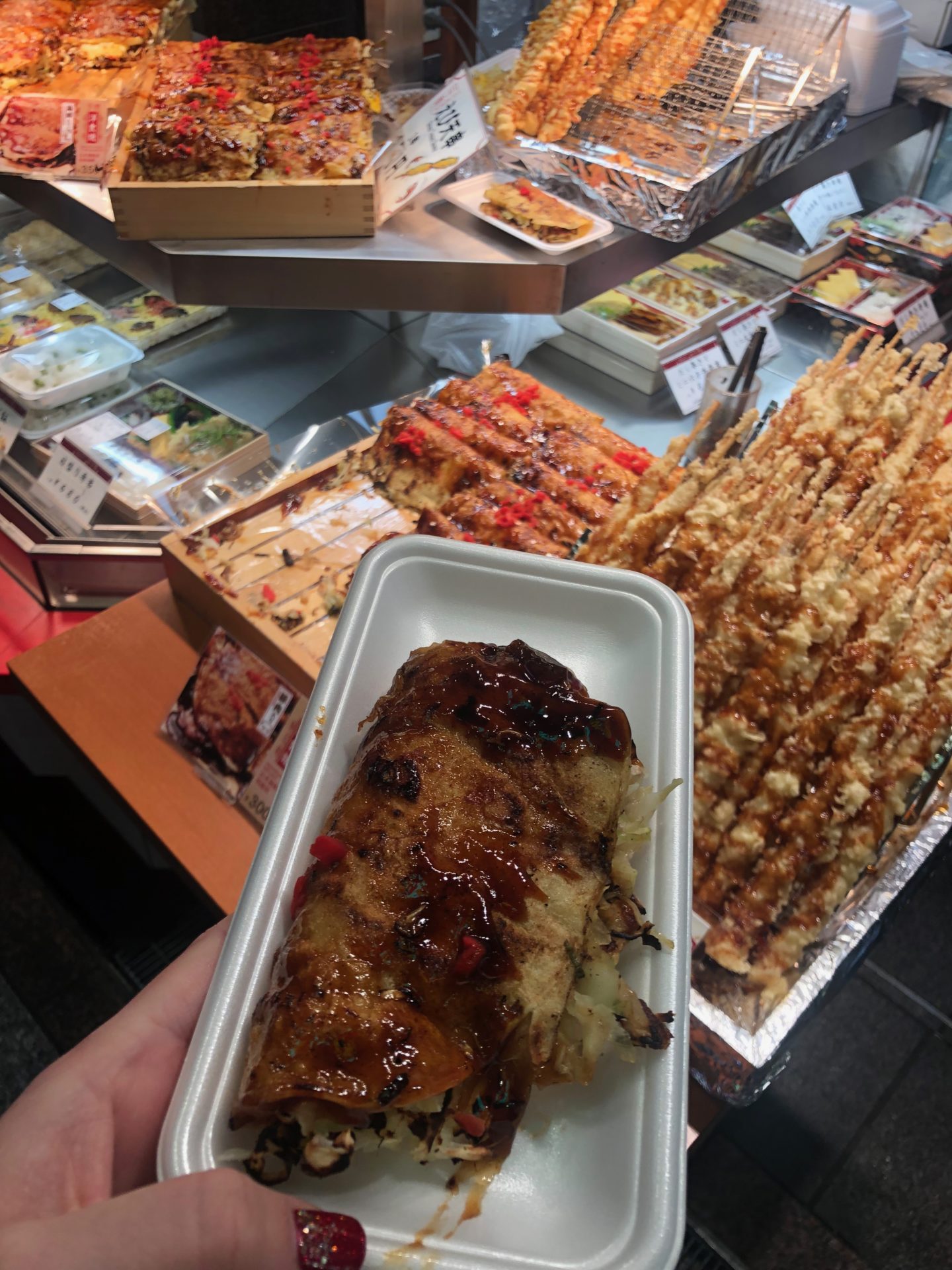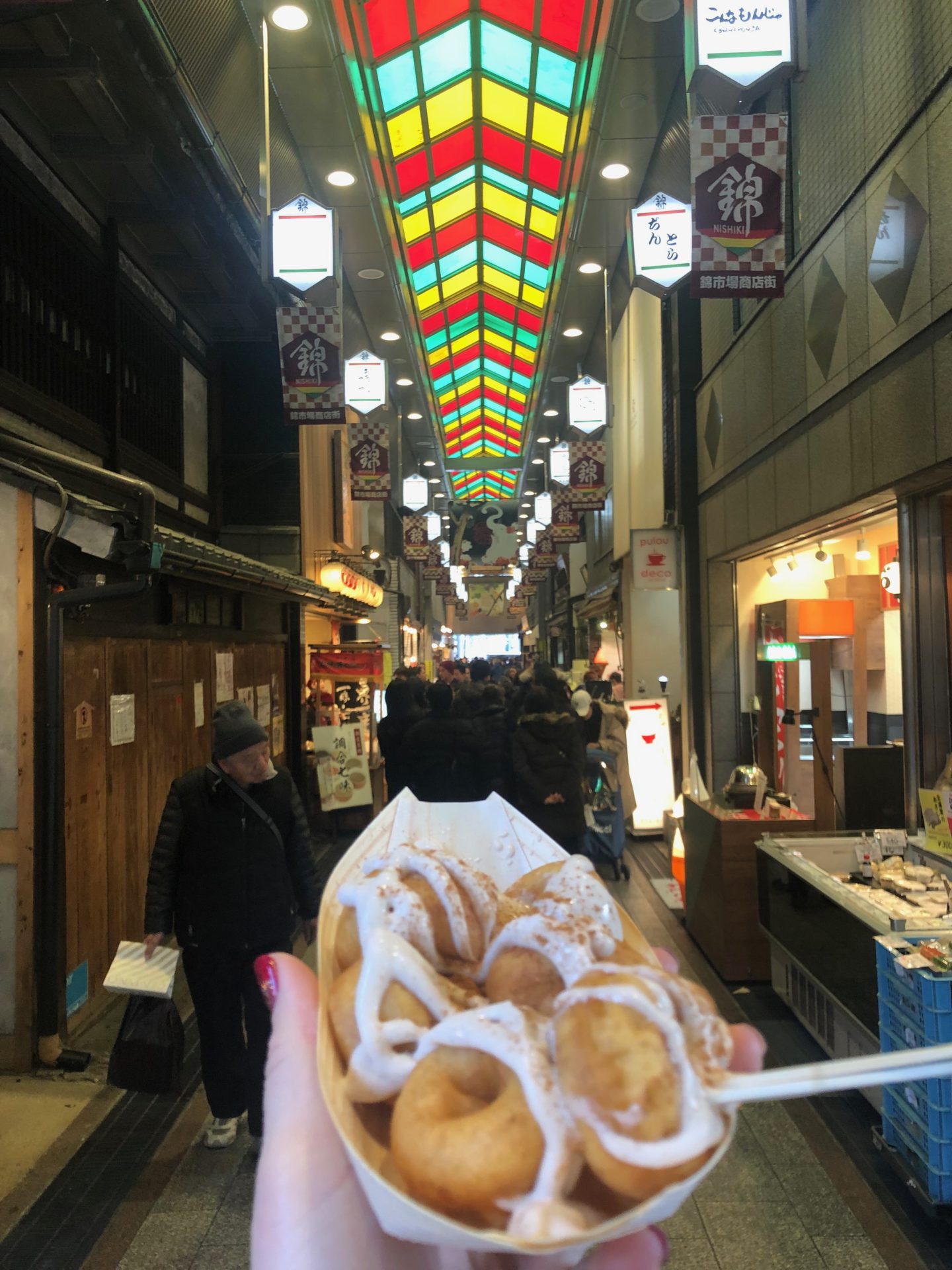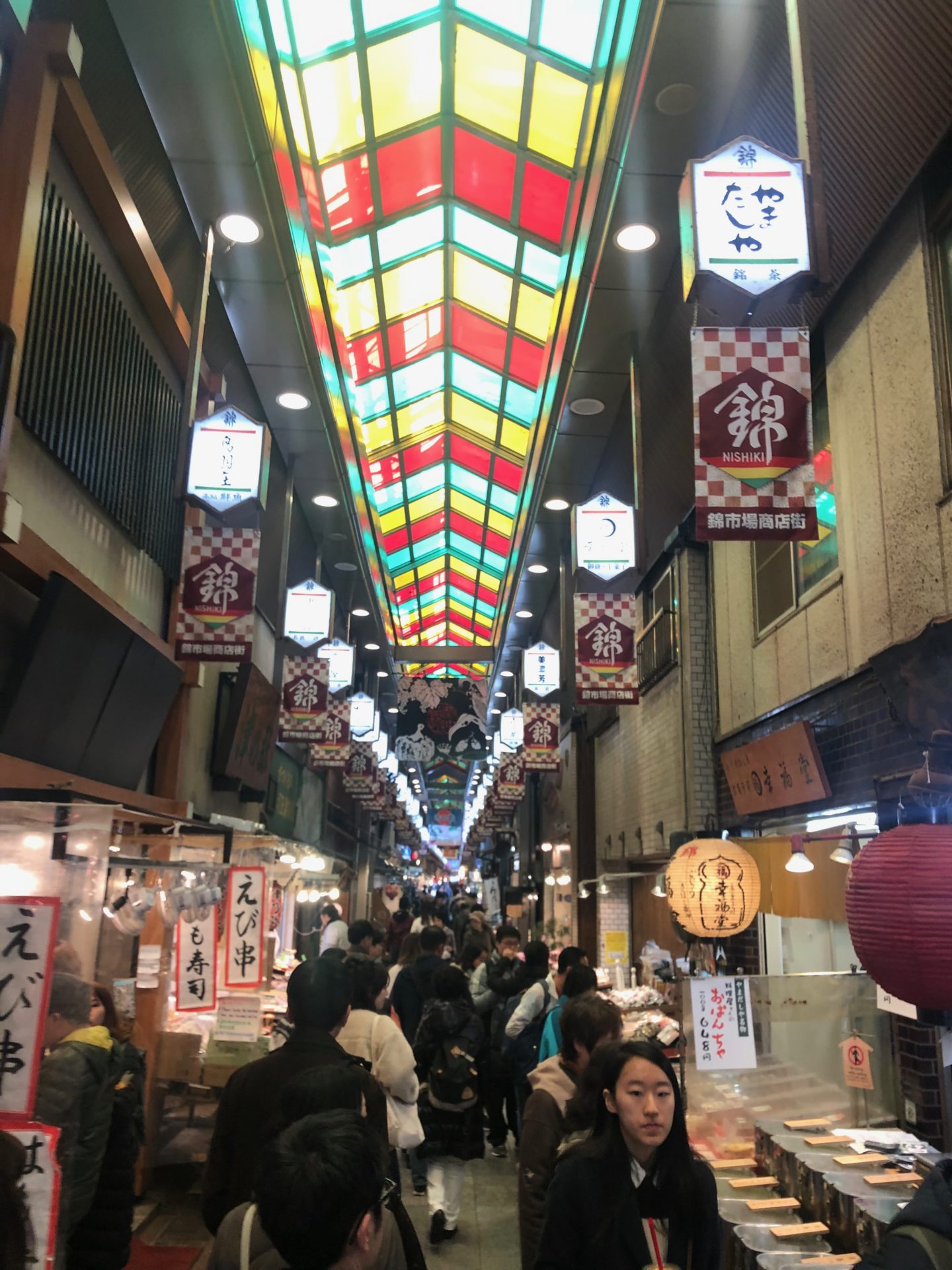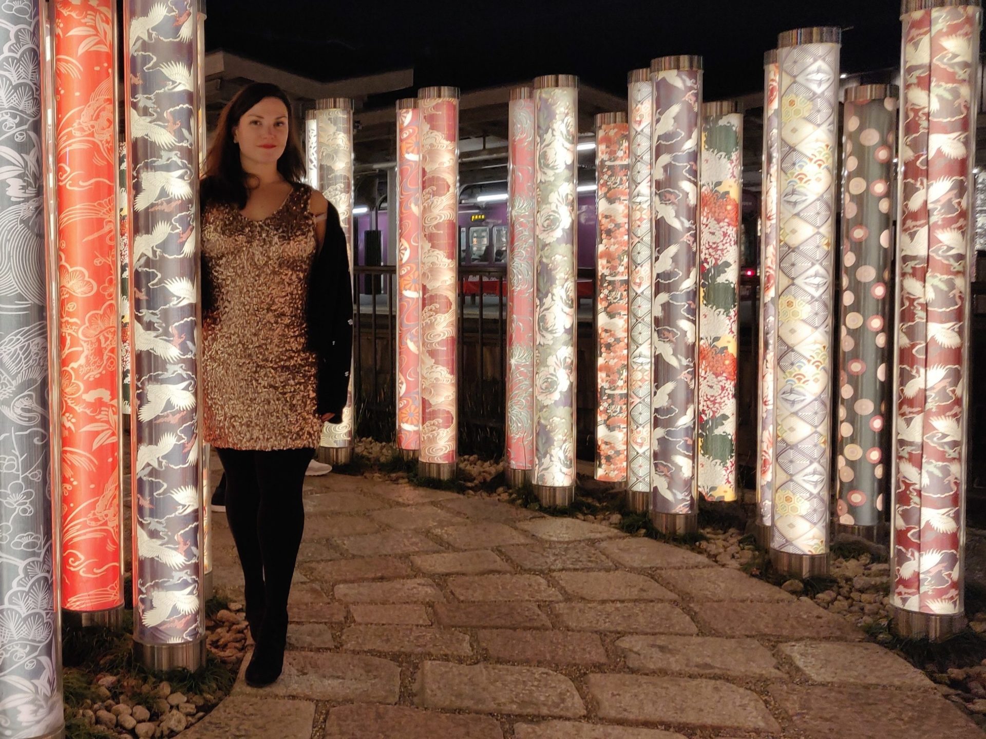 Next we hopped on a bus to Nishiki Market, a food market where we tried mochi(Japanese rice flour cakes) okonomiyaki (Japanaese savoury pancakes), soy milk doughnuts and wagyu beef skewers *drool*. We hopped back on a bus to Arashiyama Bamboo Forest, a one hour bus ride across town. We arrived at dusk, to the sound of crows cawing and echoing through the forest, very eery! It would probably be better to visit here in the daylight though. We culminated the trip with a visit to the incredible Kimono Forest nearby, a spectacle of hundreds of light poles, decorated with kimono patterns.