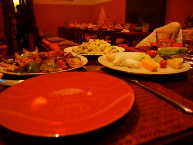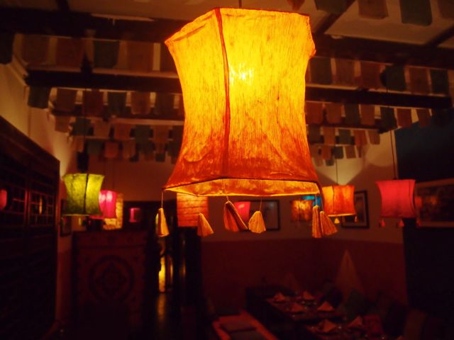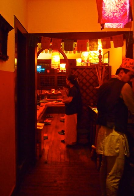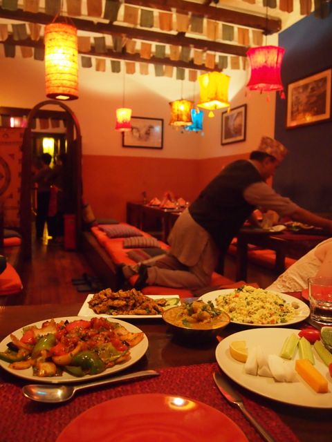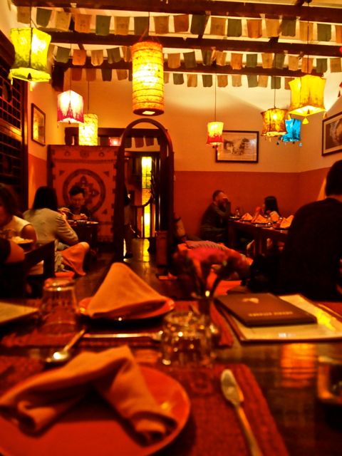Anyway, we arrived and were escorted upstairs by an amicable waitress who was dressed head to toe in red and white silk. We were then asked to switch from heels to slippers and shown to our low-slung table, which was on a raised platform, and surrounded in cushions. In typical Nepali manner, guests sit on the floor around the table, which makes dinner an extremely comfortable and relaxed affair. This is added to by the intimate size of the room in which we were seated- not more than 7 tables, mostly two-person ‘date’ tables, with one or two larger tables. The room was adorned in warm bright colours, with a sky of multicolored lanterns, and a soundtrack of upbeat and lively low key traditional Nepali music.